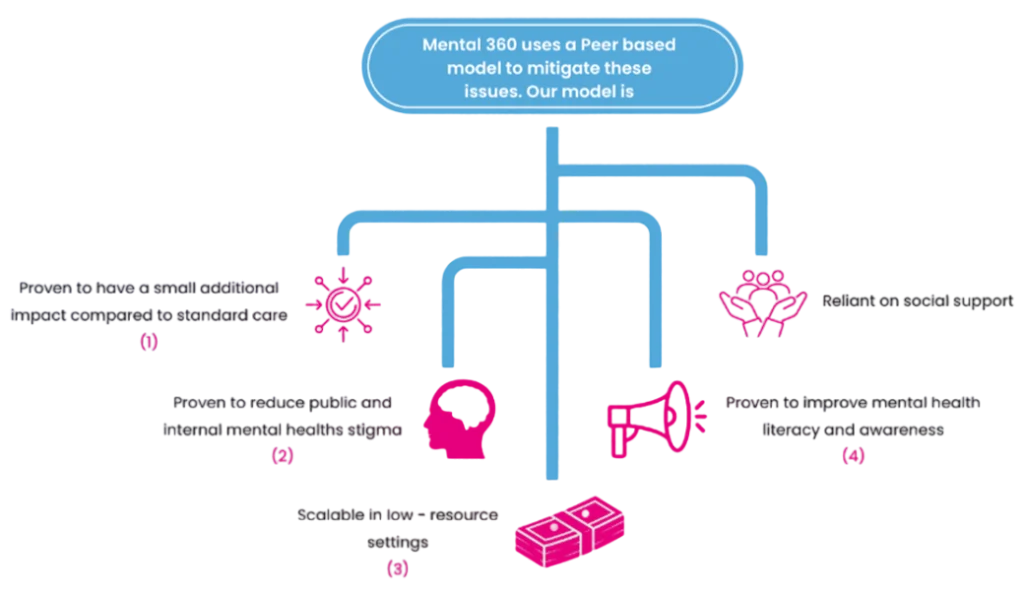 The Peer-Based Intervention Model employed by Mental 360 is underpinned by robust scientific evidence, highlighting its effectiveness in mitigating mental health challenges. Our model is designed to leverage peer support to enhance mental health outcomes, and it is supported by the following key findings: